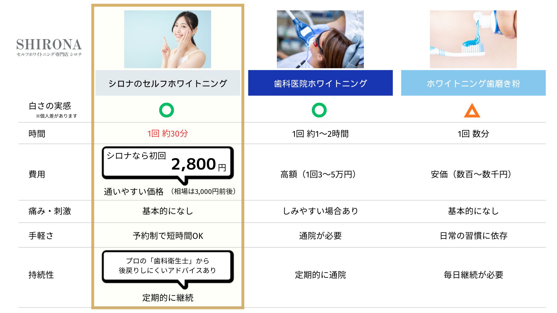 A. シロナでは、ナチュラルセルホワ・医療提携セルホワどちらも安全性を考慮したホワイトニングジェルを使用いたします。医療提携セルホワで使用しているジェルは過去3万件以上の使用実績があり、大きな事故やトラブルは出ておりません。